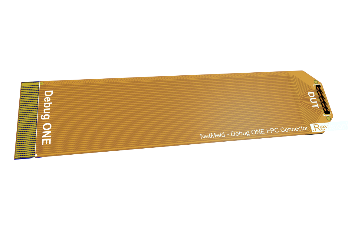 The BtB connector on the DUT does not mate directly to the NetMeld board. Between the two sits a custom FPC — a flexible printed circuit with a BtB plug on the DUT end and an FFC connector on the NetMeld end. The FPC is 150 mm long and carries a ground plane on its secondary side.